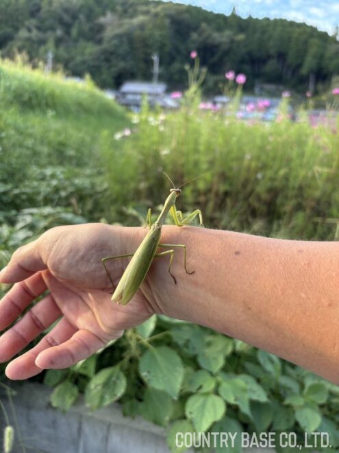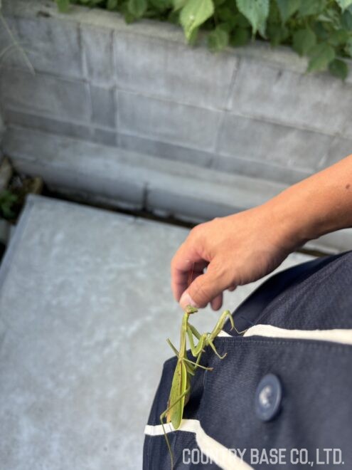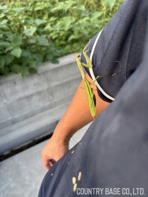 お客様の物件を訪問していたとき、草むらを通り抜けた際、カマキリがくっついてきました。
