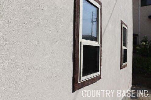 塗り壁と可愛らしい窓枠の相性は抜群。