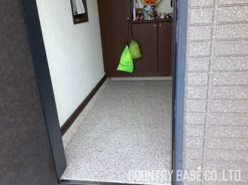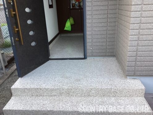 玄関アプローチから土間まで一体感のあるポリフレークで仕上げ。