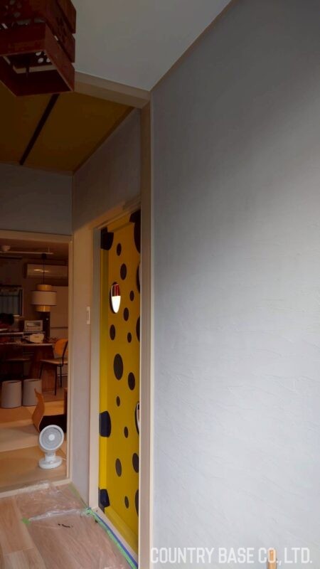 ポップなデザインの扉を引き立てる、ニュートラルな塗り壁。