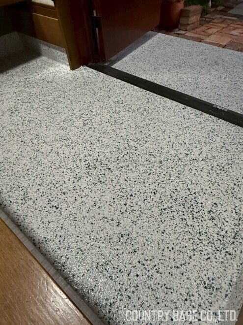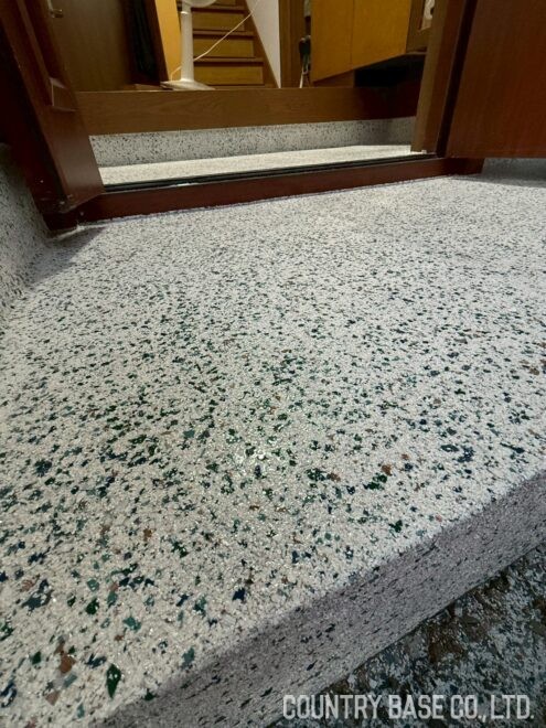 ポーチに続いて室内の框まで施工されたフレーク仕上げは、