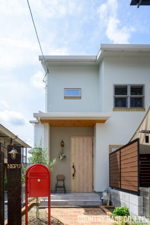 やさしいトーンの白が木の温もりや赤いポストと調和し、