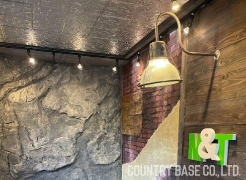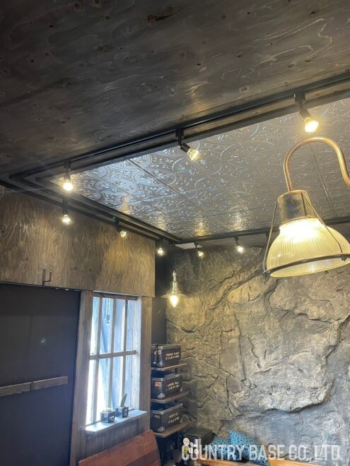 ヴィンテージ感のある照明とメタリックなティンパネルが調和し、