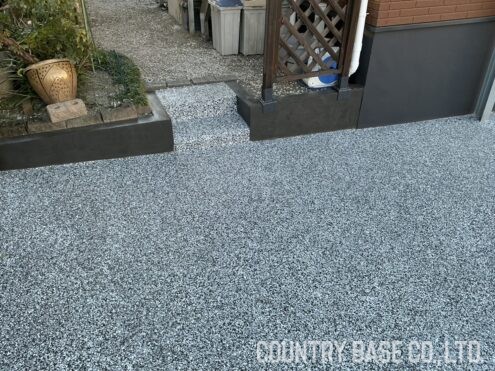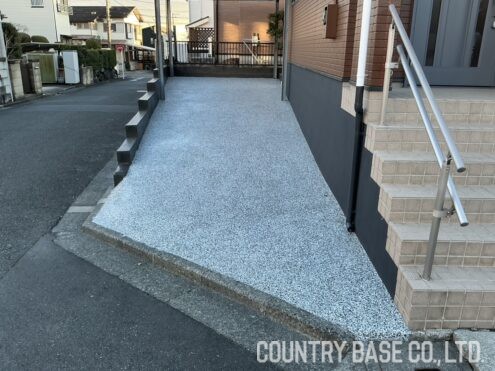 アプローチから玄関ステップ手前までを同一素材でまとめた仕上がり。